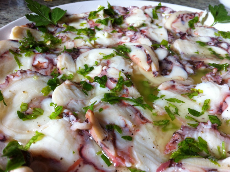 Disponete le fette di polpo su di un piatto da portata, cospargetele con del prezzemolo tritato insieme a pochissimo aglio e condite con la citronette la soppressata nel piatto.